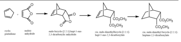 The first experiment was simply done using Diels-Alder reaction in which cyclopentadiene reacted with maleic anhydride to form endo-bicyclo-[2.2.1]-hept-5-ene-2,3-dicarbo xylic anhydride. The second experiment was done using the fischer esterification where excess methanol was used to form cis, endo-dimethyl bicyclo-[2.2.1]-hept-5-ene,2,3-dicarboxylate. The last experiment was done by the hydrogenation reaction to reduce the alkene to alkane; thus overall experiment was synthesized to form cis, endo-dimethylbicyclo-[2.2.1]-heptane-2,3-dicarbo xylate.